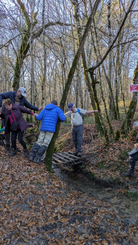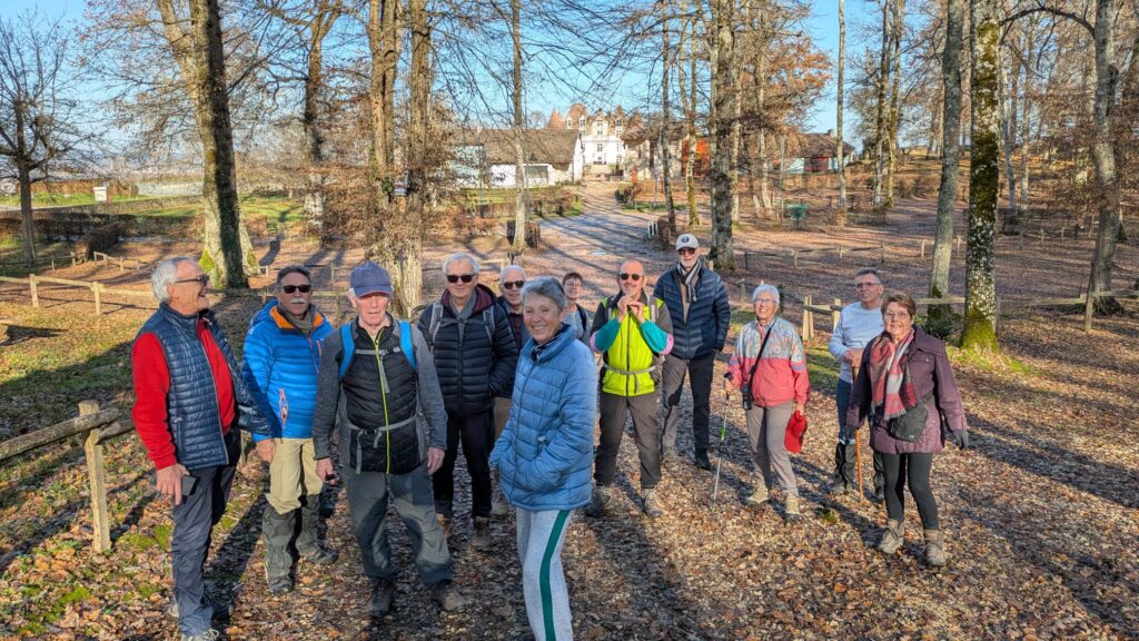 14 marcheurs, de bonne humeur, armés d’un bâton (enfin pas tous …) ont arpenté vignes et forêts proches du château et sont arrivés, bien crottés à la table des dégustations « maison ».