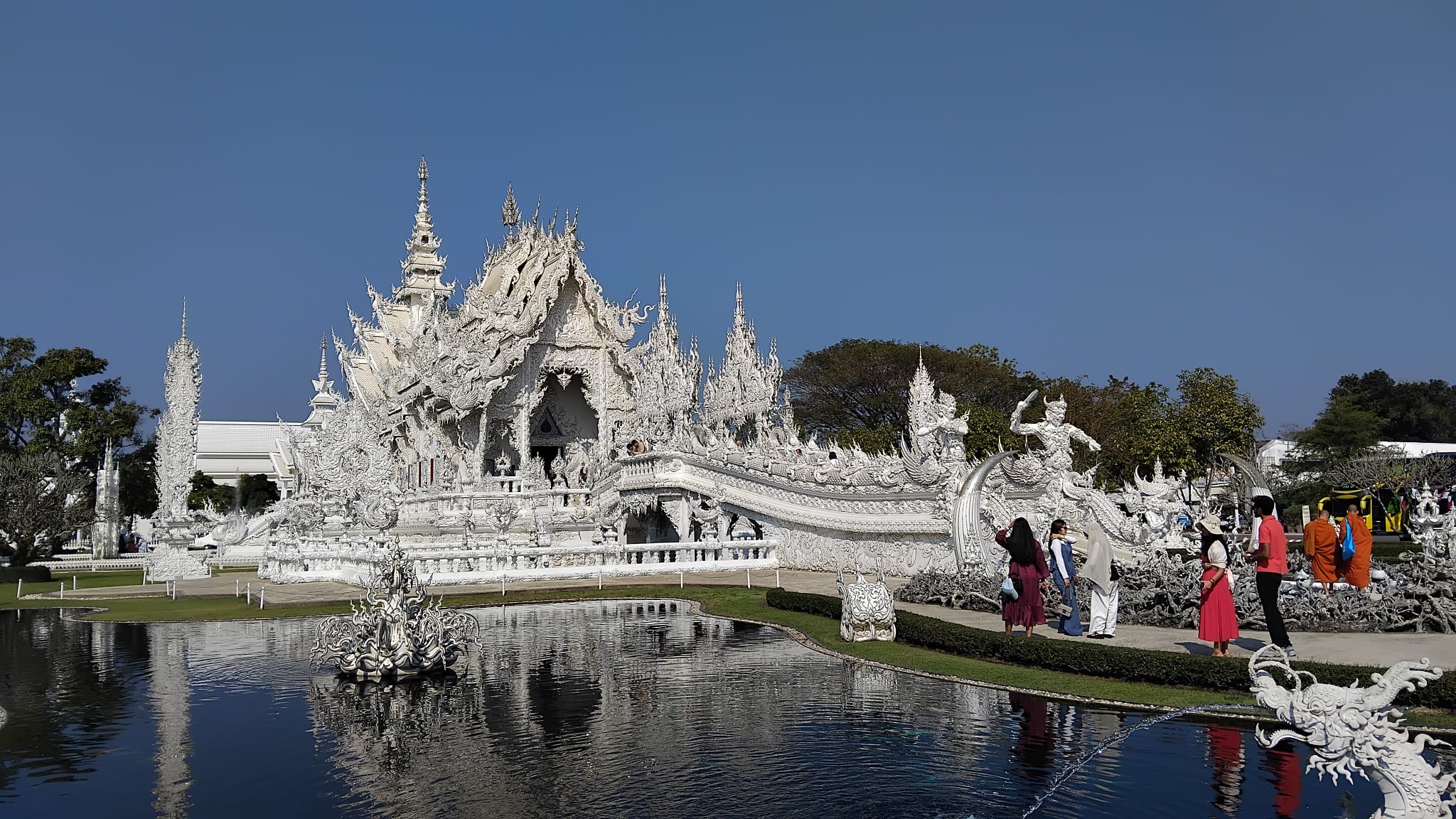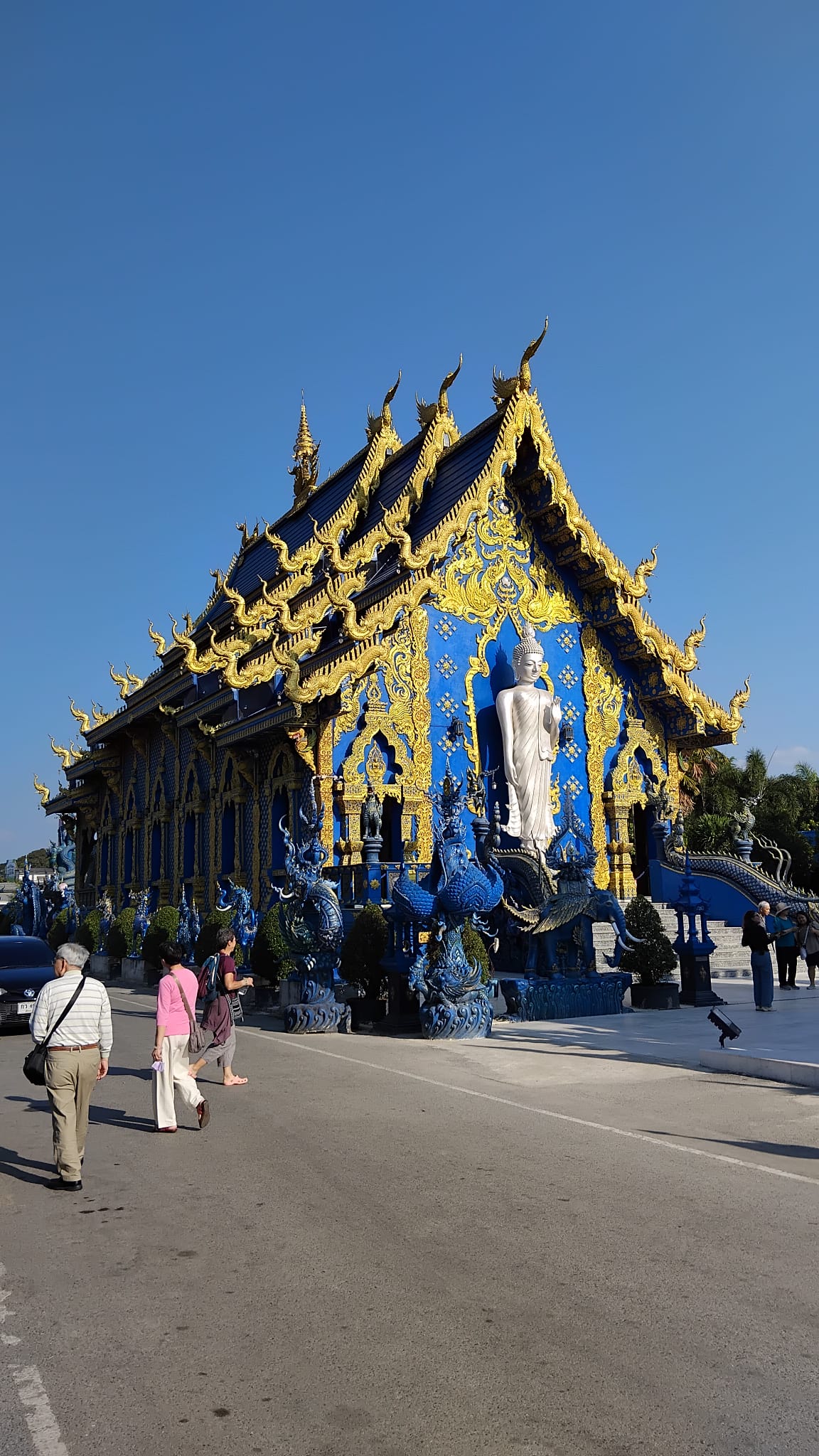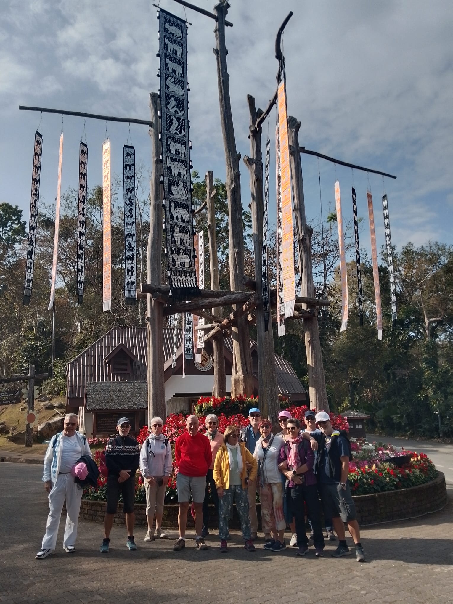 Nous avons parcouru quelques 500km, moitié sur route et moitié sur piste, hors des sentiers battus : peu de touristes lors de nos visites locales, ce qui ne fut pas le cas à Chiang Mai et Chiang Rai lors des visites des temples (entre autres le Blanc et le Bleu) et plus au Nord dans le Triangle d’Or (frontières Myanmar, Laos et Thailande). Un col a également été franchi (col des Dinosaures) a environ 1000m avec un repas pris dans un village AKHA où nos hôtes nous ont entrainé dans leur danse locale.